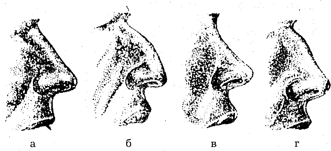 Рис. 18. Форма спинки носа: а — прямая, б — выпуклая, в — вогнутая, г — прямоволнистая.