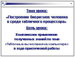 | Цель урока: Комплексное применение полученных знаний по теме «Табличные вычисления на компьютере» в ходе практической работы «Построение биоритмов человека в среде табличного процессора» | |