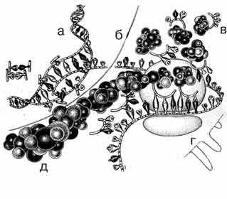 Рис. 23. Схема синтеза белка в клетке: а - двухцепочная спираль ДНК; б - одноцепочная молекула РНК; в - транссортные РНК с молекулами аминокислот на «хвосте»; г - рибосома, на которой происходит синтез белка из аминокислот; д - синтезированная белковая цепь