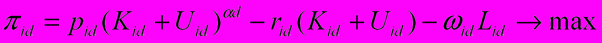 где Kid - затраты капитала i-го предприятия промышленности; Lid-затраты труда i- м предприятии; Uid - инвестиции в развитие производства; рid, rid, ωid - цена продукции, капитала и труда; αd - коэффициент эластичности производственной функции d -й отрасли.