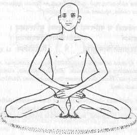 Сядьте в ваджрасану и максимально широко разведите колени. Затем поместите пятки под мошонку или по бокам влагалища. Пятки соединены вместе, а подушечки стоп находятся под ягодицами.