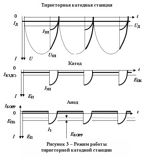 Применение импульсных тиристорных защитных катодных станций усугубляет положение, так как амплитуда защитного импульса UИ значительно превышает защитный потенциал UЗ подземного трубопровода, в связи с чем катодная защита при подаче защитных импульсов работает всегда в режиме перезащиты, что приводит к разложению электролита с выделением атомарного водорода, проникающего в стальную трубу.