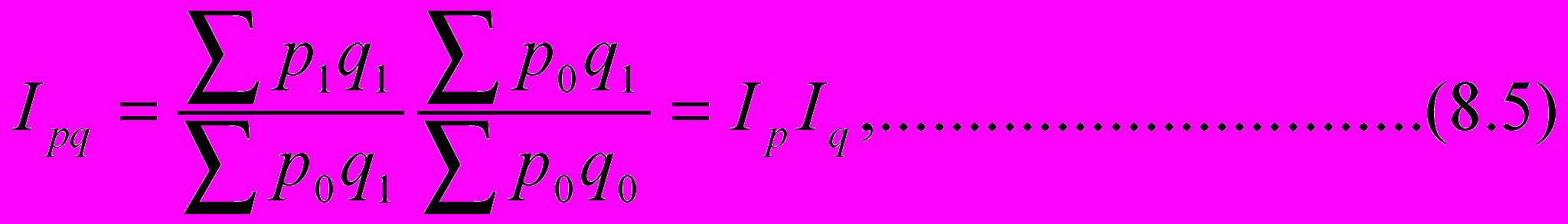 грегатный индекс объема реализации. Как видно из (8.6), агрегатный индекс цены (качественного показателя) определяется при фиксированном количественном показателе q1 в отчетном периоде, а агрегатный индекс (8.7) объема реализации – при фиксированном качественном показателе р0 в базисном периоде. Разумеется, такой выбор фиксированных параметров является условным, но общепринятым, хотя можно было бы принять обратные периоды и изменить определения (8.6) и (8.7).