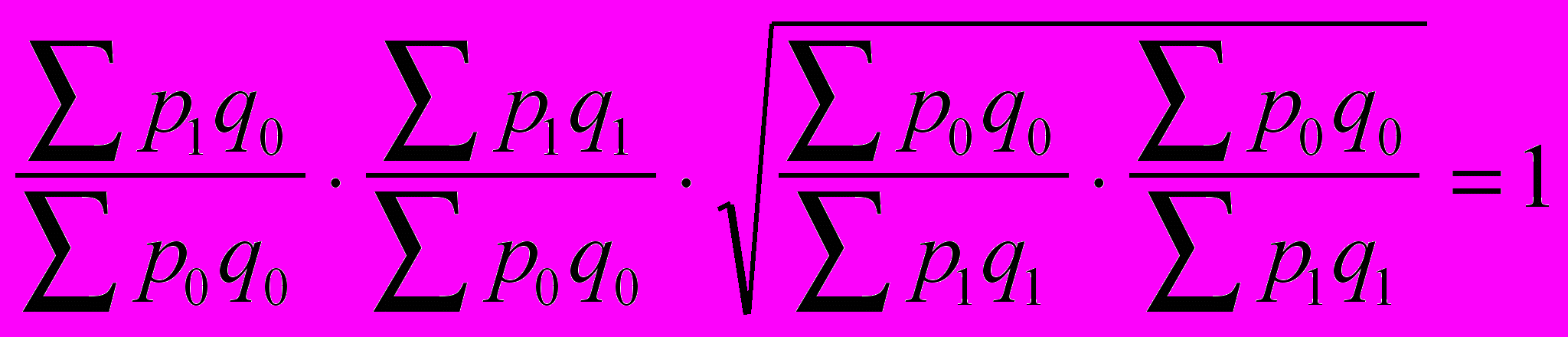 И Фишер назвал эту формулу расчета индекса идеальной формулой. Идеальность формулы заключается прежде всего в том, что индекс является обратимым во времени, т.е. при перестановке базисного и отчетного периодов полученный “обратный” индекс - это обратная величина величины первоначального индекса. Этому условию отвечает любой индивидуальный индекс. Например, индекс цен равен: