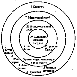 [Надписи окружностей от центра во вне: IV. Сущность: Любовь, Сердце; III. Эмоциональный слой: Гнев, Боль, Отчаяние, Страх; II. Мышечный слой: Хроническое мышечное напряжение; I. Слой эго: Отрицание, Недоверие, Обвинение, Проекция, Рационализация.]