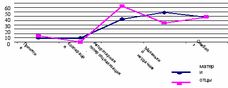 Результаты исследования родительского отношения к подросткам, полученные в ходе обследования матерей и отцов мы представили в виде графика, который более наглядно показывает общие и отличительные моменты отношения родителей к воспитанию подростков (рис.5).