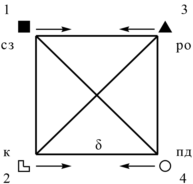 Для типа ИМ «Дон Кихот», который стал для этой книги традиционным примером, такой является квадра «дельта»: «Штирлиц» (1), «Достоевский» (2), «Гексли» (3), «Габен» (4) (рис. 14).