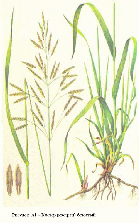 На рисунке А1 показан костер безостый (кострец безостый) - многолетний корневищный верховой злак озимо - ярового типа развития высотой 80-150 см. Корневая система мощная, корни достигают глубины 2 м и более. Образует большое количество удлиненных, хорошо облиственных вегетативных побегов.
