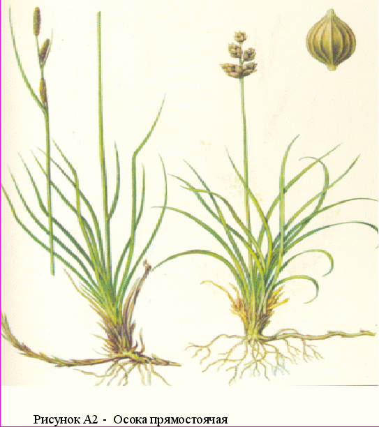 На рисунке А2 - осока прямостоячая. Многолетнее светло- или желтовато-зеленое растение высотой 10-60 см. Стебли гладкие, у основания одеты рыхлыми охристыми или буровато-красными влагалищами. Листья плоские, желобчатые, желтоватые. Вегетация начинается в конце мая—июне, в конце июня — начале июля плодоносит. Крупный рогатый скот поедает ее удовлетворительно, овцы и козы — плохо, а лошади — хорошо до наступления фазы плодоношения. Особенно ценна в кормовом отношении отава. Химический состав свидетельствует о высокой питательной ценности. В фазе цветения содержит 24,5% протеина, 23,2 клетчатки и 44,7% безазотистых экстрактивных веществ.