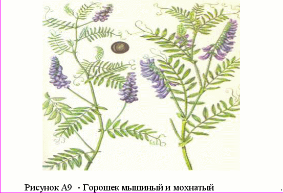 Рисунок А9 - Горошек мышиный и мохнатый. Однолетник, реже двулетник, высотой 30-70, до 100 см. Глубоко идущий стержневой корень имеет хорошо развитые боковые ответвления. Основная масса корней залегает на глубине до 30 см. Стебель слабый, лазящий, листочки 6-8-парные, линейно-ланцетные. Кисти не очень густые, венчик лиловый, бобы широколинейные. Все растение густо волосистое.