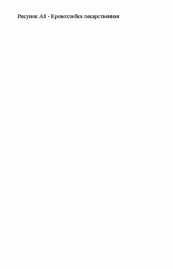 Рисунок А8 - Кровохлебка лекарственная - многолетнее травянистое растение из семейства розанных. Корень мощный, развивающий прикорневую розетку листьев. Стебель одиночный, высотой до 100 см, ветвистый, прямостоячий. Прикорневые листья перистые, листочков 7-25, они сидят на черешках, имеют прилистники. Стеблевые листочки продолговато-яйцевидные или эллиптические, зубчатые, плотные, сверху темно-зеленые, блестящие, снизу седоватые, голые. Верхние стеблевые листья небольшие, сидячие. Цветки собраны в цилиндрические головки, темно-красные или почти черно-пурпурные, обоеполые. Растет на суходольных и заливных, иногда солонцеватых лугах, в луговых степях, на опушках лесов, открытых травянистых склонах, по окраинам болот, берегам рек. На пойменных лугах нередко является преобладающим растением в луговых травостоях.