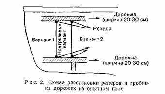 После посева (посадки) восстанавливают границы контрольных полос, а после появления полных всходов на торцах опытных и контрольных полос (в местах, от которых будет вестись уборка) вырубают дорожки шириной 20—30 см; в дальнейшем их используют для прохода при наблюдениях за посевами в течение вегетационного периода (рис.2). *