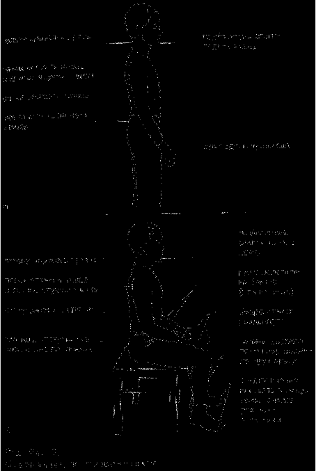 Способность ходить улучшает поза со стабильным положением позвоночника. Для этого туловище и голову нужно держать очень прямо, подбородок должен быть слегка опущен (рис. 9). Необходимо научиться принимать эту позу автоматически, бессознательно. Вот почему методист ЛФК постоянно поправляет больного во время лечения, а упражнения часто выполняются перед зеркалом. Благодаря этому больной видит, в каком положении он находится, насколько правильно он выполняет те или иные движения, доволен ли им методист. Это позволяет ему контролировать себя до тех пор, пока движение не будет усвоено. Одновременно выполняются упражнения на расслабление с целью уменьшения спастичности и силовые упражнения, например, упражнения в положении стоя на четвереньках с совершением движений руками и ногами (рис. 10а, б, в).
