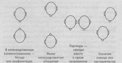 Представьте себе простейший случай взаимодействия между двумя людьми (рис. 65). Если они стоят лицом к лицу на близком расстоянии, их психогеография создает и поддерживает непосредственное и настолько же интенсивное взаимодействие между ними (позитивное или негативное). Если эти двое отойдут чуть дальше друг от друга, интенсивность взаимодействия, скорее всего, уменьшится. Если они стоят «бок о . бок», вероятнее всего, общая природа их взаимоотношений и взаимодействия слегка изменится: они будут больше напоминать партнеров или членов одной команды, сконцентрированных на общем направлении или задаче, а не друг на друге. Если человек стоит слегка позади и сбоку от другого человека, он почти наверняка возьмет на себя роль его помощника или наставника.