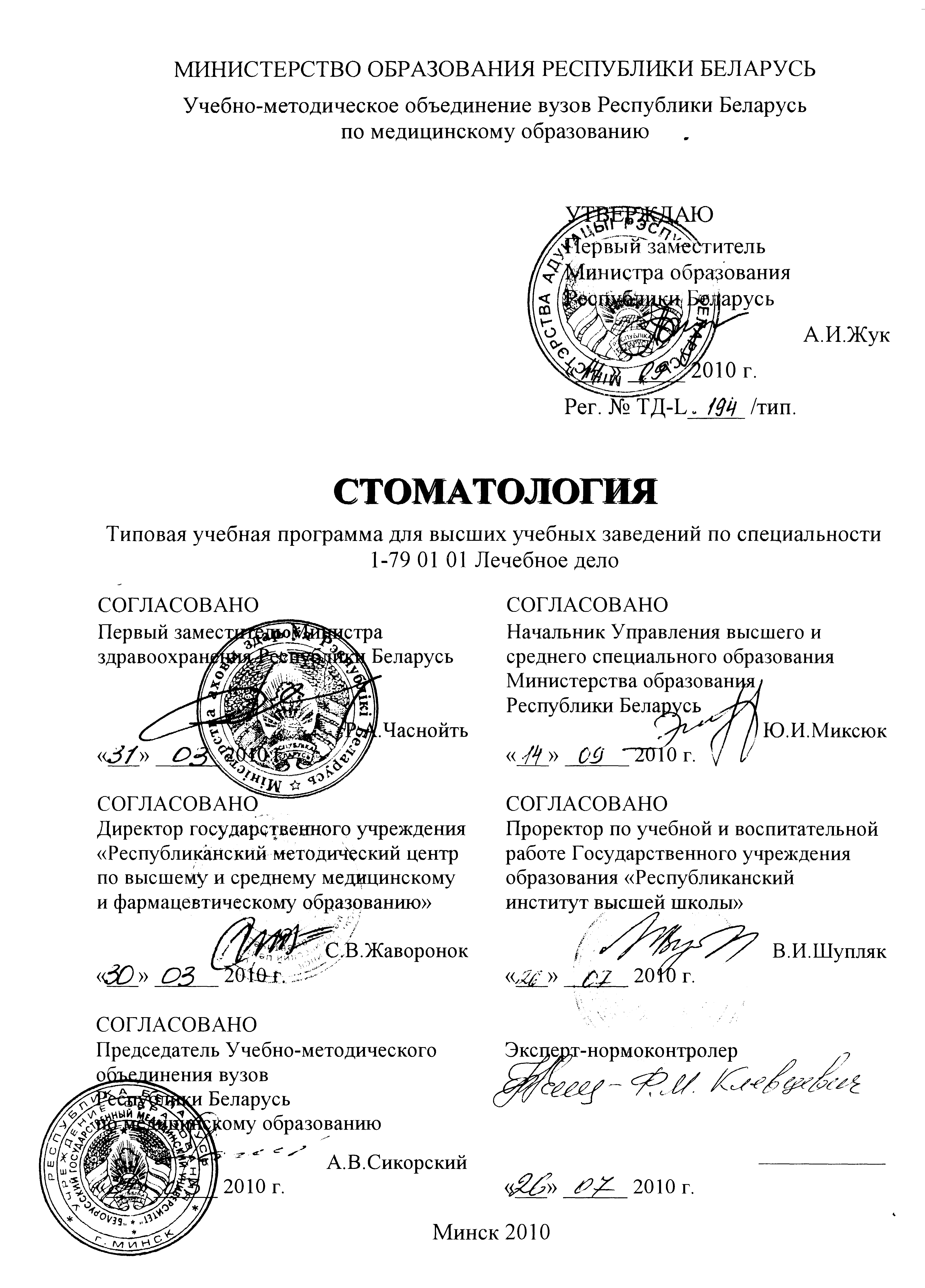 - типовой учебный план по специальности высшего медицинского образования первой ступени 1-79 01 01 «Лечебное дело» (регистрационный № L 79-005/тип), утвержденный Министерством образования Республики Беларусь 16 апреля 2008 г.