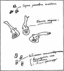 Шесть месяцев спустя его рисунок (рис 8) говорил уже о наличии большего взаимодействия между лейкоцитами и раком, но относительные размеры опухоли и этих лейкоцитов не предполагали абсолютного перевеса в силе со стороны защитной системы организма Внезапно, откуда ни возьмись, появлялся огромный лейкоцит, который разбивал опухоль, и ее осколки подбирали обычные лейкоциты Рисунок снова показывал, что должно произойти что то экстраординарное, что, пока не произойдет чуда, рак будет оставаться цел и