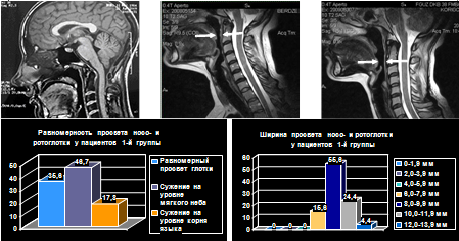 Среди пациентов 1-й группы равномерная ширина просвета носоглотки и ротоглотки наблюдалась в 35,6% случаев; у 46,7% наиболее узкая часть просвета глотки находилась на уровне мягкого нёба, а у 17,6% - на уровне корня языка.