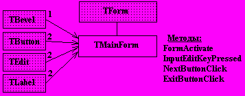Все окна приложения строятся на базе класса формы TForm. В терминах библиотеки VCL форма - это окно, которое может содержать другие визуальные (т.е. имеющие графический образ на экране - кнопки, метки, строчный редактор и т.д.) и невизуальные компоненты. Соответствующие компонентам объекты в качестве объектных полей включаются в класс, порождаемый от TForm (рис. 4.15).
