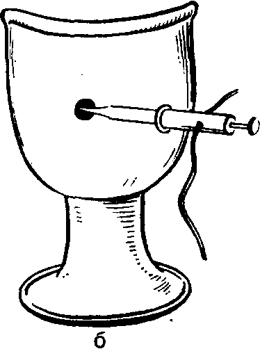 ваническим током в камерных ваннах. В этом случае больной помещает конечности в фаянсовые ванночки, которые заполняют водой (рис. 5). В офтальмологической практике для гальванизации и электрофореза используют глазные ванночки (рис. 6).