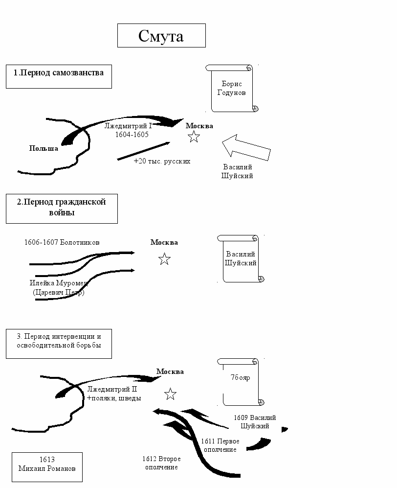 б) выделить этапы «Смутного времени» и изобразить в виде схемы.
