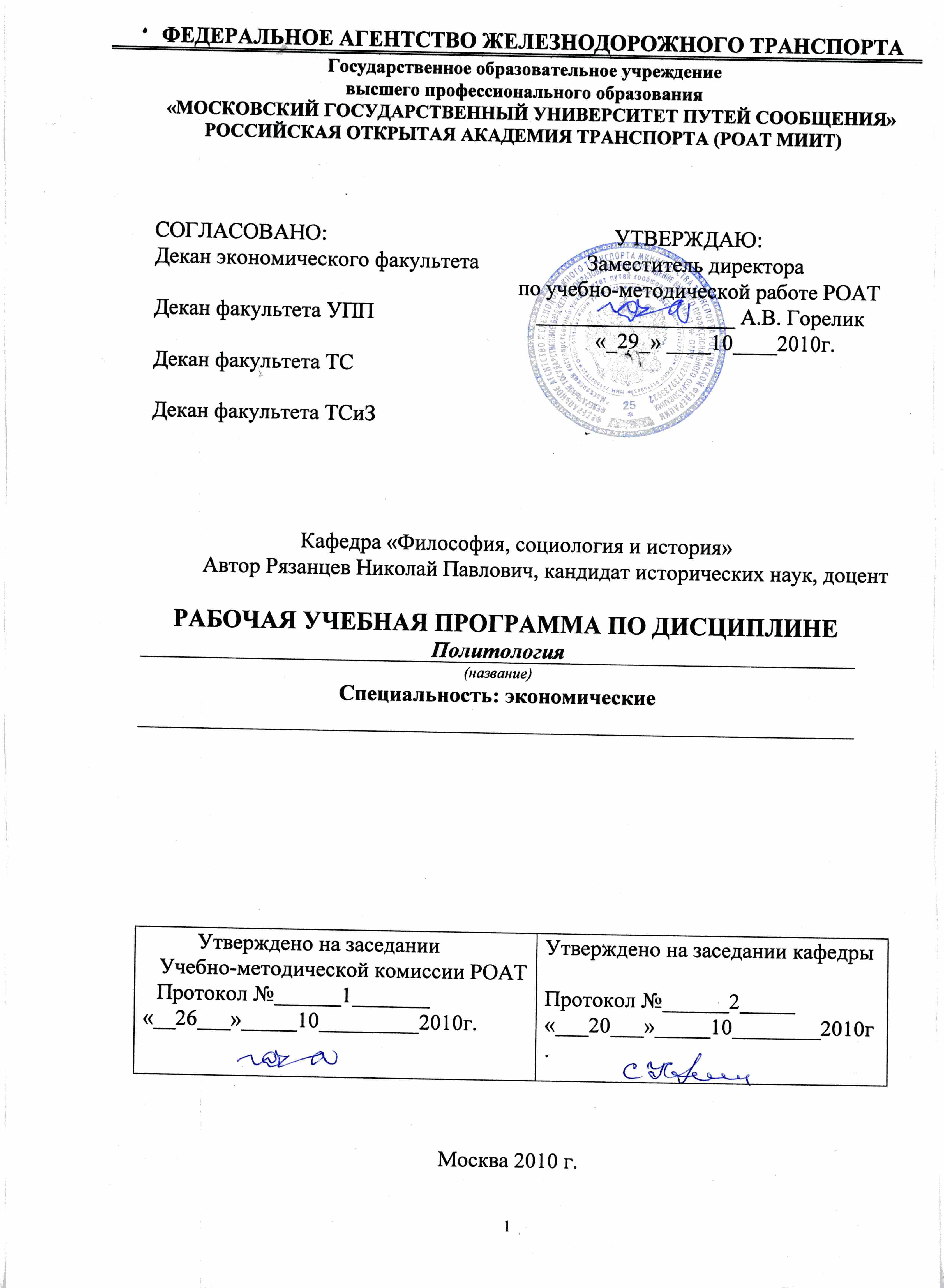 Учебно-методический комплекс по дисциплине «Политология» составлен в соответствии с требованиями Государственного образовательного стандарта высшего профессионального образования/основной образовательной программой по всем специальностям.