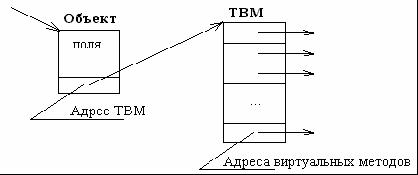 Реализация механизма позднего связывания осуществляется с использованием специальной таблицы, получившей название таблицы виртуальных методов (ТВМ). ТВМ создается для каждого класса, имеющего собственные или наследующего виртуальные методы. Она содержит адреса виртуальных методов (рис. 1.24). Объекты таких классов содержат адрес ТВМ своего класса. При вызове виртуального метода для объекта происходит обращение к ТВМ класса, по которой и определяется требуемый метод.
