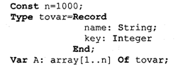 Как правило, сортируемые данные располагаются в массивах. В простейшем случае это числовые массивы. Однако для нечисленных алгоритмов более характерна ситуация, когда сортируется массив записей (в терминологии Паскаля) или массив структур (в терминологии Си). Поле, по значению которого производится сортировка, называется ключом сортировки. Обычно оно имеет числовой тип. Например, массив сортируемых записей содержит два поля: наименование товара и количество товара на складе. В программе на Паскале он описан так: