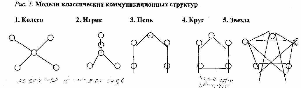 «Классическими» коммуникационными структурами обычно считают: колесо, игрек (рюмка), цепь, круг, звезда (тотальная коммуникация) - см. рис.1.