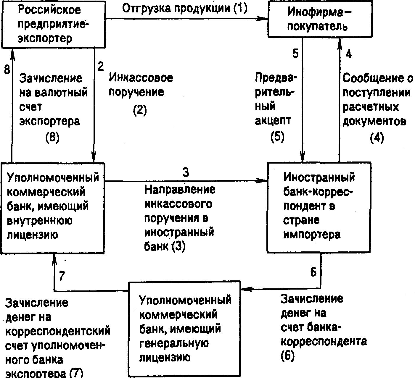 При расчетах банковскими переводами по экспортным операциям схема аналогична: иностранный банк-корреспондент направляет российскому уполномоченному банку, где открыт валютный счет экспортера, телексное или SWIFT сообщение о перечислении средств и деталях платежа.