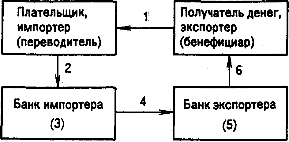 Операции: 1 - экспортер передает импортеру документы об отгрузке товара, предусмотренные контрактом; 2 - импортер сдает в банк заявление-поручение о перечислении денег; 3 - банк снимает деньги со счета; 4 - банк пересылает деньги в банк экспортера; 5 - банк экспортера зачисляет деньги на счет поставщика (экспортера), списав их со счета банка-корреспондента; 6 - передача экспортеру выписки из его счета о зачислении средств.