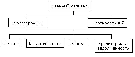^ Заемный капитал (рис. 10.4) — это кредиты банков и финансовых компаний, займы, кредиторская задолженность, лизинг, коммерческие бумаги и др. Он подразделяется на долгосрочный, (более года) и краткосрочный (до года).