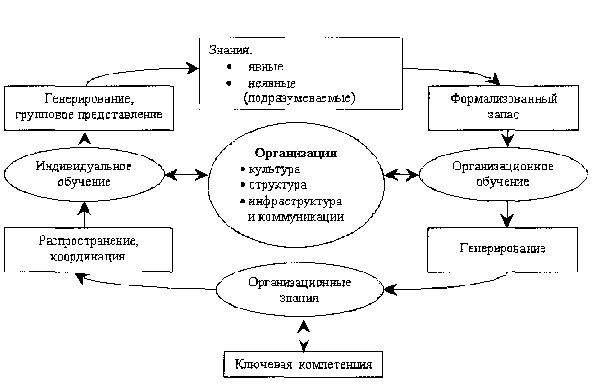 Управление знаниями преследует две основные цели. Первая повышение эффективности через использование знаний для роста производительности; вторая инновации создание новых: продуктов и услуг, компаний, бизнес-процессов. При этом важно стремиться к формированию такого подхода к управлению знаниями, который соотносит, уравновешивает и интегрирует организационные, человеческие и технологические компоненты знаний. Взаимосвязь знаний, обучения и ключевой компетенции компании представлена на рис. 4.