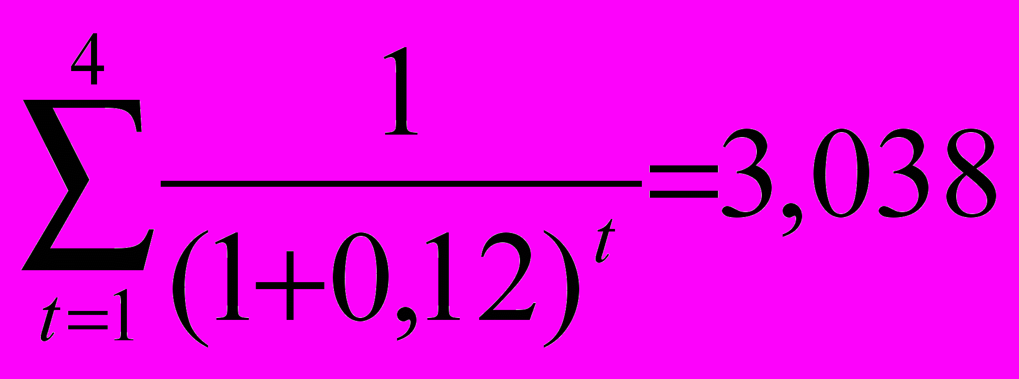 Сумма вложения капитала 900 тыс. дол., продолжительность вложения -4 года, годовой приток денежных средств 300 тыс. дол., процентная ставка -10% годовых (т.е. 0,1 доли единицы).