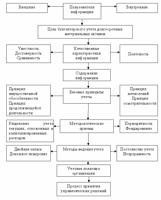 На рисунке 2 нами разработана и предложена концептуальная схема бухгалтерского учета долгосрочных материальных активов. Данная концептуальная схема позволяет использовать в современном учете действующие и выделить принципиально новые подходы. Цель бухгалтерского учета определяется интересами пользователей информации. Поэтому в основу разработки концептуальной схемы положены данные критерии.