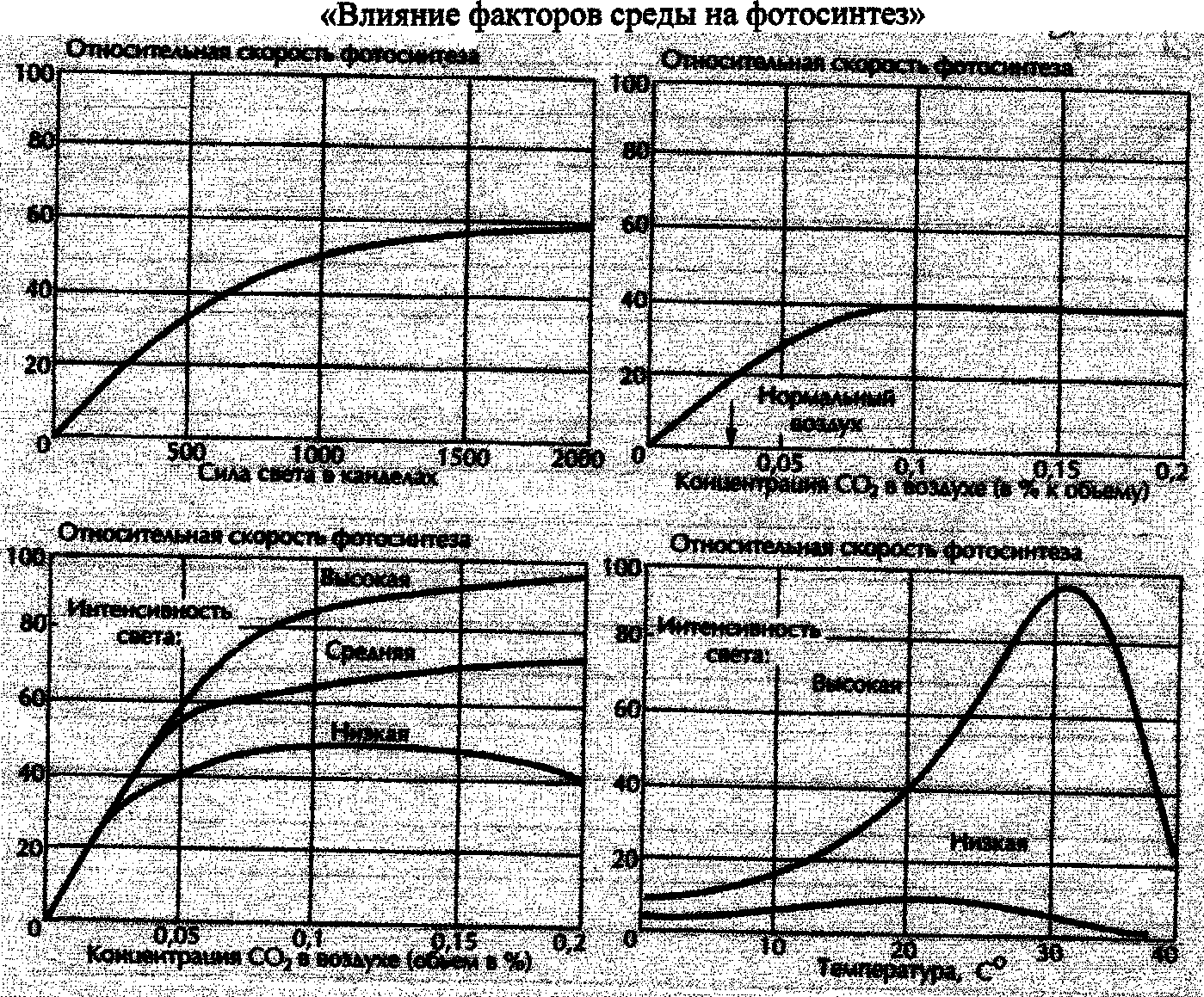 Изучив графики, обсудив коллективно, ответьте, можно ли утверждать о пропорциональной зависимости скорости фотосинтеза от условий. В частности, верно ли утверждение: «Чем выше содержание СО2 в воздухе, тем выше скорость фотосинтеза?» Свои соображения поясните и обобщите.