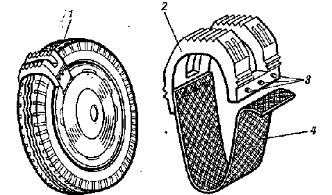 Противобуксовочная манжета (рис. 56) изготовляется из старой покрышки и закрепляется на шине при помощи ремня 4 из прочного брезента, пропущенного через отверстие в диске колеса. На каждое колесо рекомендуется устанавливать не одну, а несколько манжет, располагая их равномерно по окружности.