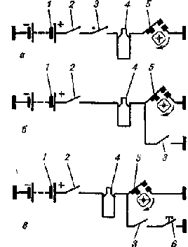 а — с включателем в первичной цепи зажигания; б — с замыканием контактов распределителя зажигания; в — с концевым выключателем;