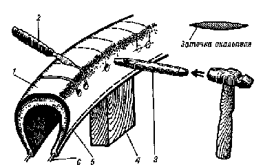 Рис. 59. Изготовление резиновой «цепи» противоскольжения: 1 — покрышка-заготовка; 2 — скальпель; 3 — пробойник; 4 — деревянная подкладка; 5 — линия обреза бортов; 6 — проволочное кольцо