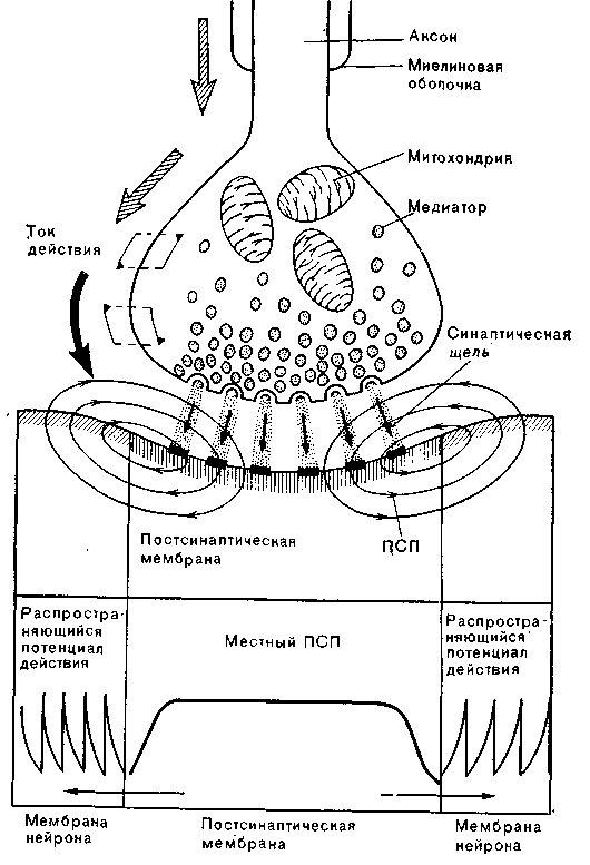 ПСП — аналоговый сигнал. Если к синапсу не приходят импульсы, регистрация при помощи электродов, введенных в пост-синаптический нейрон около мембраны, выявляет состояние покоя. При стимуляции пресинаптического волокна между двумя сторонами мембраны регистрируется разность потенциалов, которую называют постсинаптическим потенциалом (ПСП). Это локальный ответ, и он отличается от потенциала действия тем, что не следует закону «всё или ничего» и ограничен постсинаптическим участком мембраны. Он представляет собой аналоговый сигнал, способный генерировать в примыкающей мембране новую серию потенциалов действия (рис. 55).
