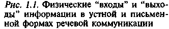 | В этой схеме, правда, не указан такой компонент, как источник шумов (в инженерно-математической теории коммуникации обязательно учитывается возможная деформация сигнала, ведущая к определённой потере информации). С тем чтобы избежать потерь, к коду предъявляется требование определённой избыточности. Естественные языки обычно характеризуются высокой избыточностью, позволяющей распознавать речевые сигналы с достаточной степенью надёжности. Так, в русском высказывании Маленькая девочка горько плакала признак [+женский род (и пол)] кодируется четырежды: корневой морфемой дев-, окончанием -а существительного, окончанием -ая прилагательного, окончанием -а глагола. Звуковой механизм речевой коммуникации Речевая коммуникация представляет собой особый вид взаимодействия людей, который связан с передачей разнообразной информации, относящейся как к внешнему, так и к внутреннему миру человека. От других способов передачи информации, например, с помощью жестов, мимики, речевая коммуникация отличается тем, что использует очень мощный и гибкий инструмент человеческого языка. Коммуникативная функция языка базируется на его знаковой природе. Знаковые единицы языка, среди которых центральной является слово, имеют значение (означаемое) и звуковую форму (означающее). Означаемым слово обращено к миру понятий, а означающим — к миру произнесений и звучаний. Слова являются основным строительным материалом речевых сообщений, и, как писал замечательный русский лингвист Л.В. Щерба, "некоторый их репертуар необходимо иметь в памяти для осуществления речи" . Исходной формой речевой коммуникации является звучащая речь, в которой информация физически передается от одного человека к другому в виде звуковых колебаний. Однако во всяком цивилизованном обществе используется и коммуникация с помощью письма. В письменной речи информация физически воплощается в различных графических символах, обычно базирующихся на единицах звуковой формы речи. Письменная речь основывается на навыках письма и чтения, устная — на навыках произношения и звукового восприятия. Специфические для каждой формы коммуникации умения совмещаются в сознании человека с общими мыслительными и языковыми механизмами, которые позволяют формулировать и передавать информацию в процессе говорения и извлекать ее в процессе понимания речи. Навыки письменной и устной речи, будучи тесно связанными, обладают в то же время определенной автономностью. Поэтому возможны комбинации в их использовании: человек может читать вслух письменный текст с разной степенью проникновения в его внутреннее содержание (разной глубиной понимания), может записывать звучащую речь, следуя правилам письменной речи, и т. д. (рис. 1.1). Навыки общения с помощью звуков формируются у человека в раннем детстве вместе с усвоением родного языка. Для этого не требуется, в отличие от письма и чтения, какое-либо специальное обучение. У взрослого человека навыки звукового общения настолько автоматизированы, что построение речевых высказываний и их понимание не вызывает, как правило, никаких затруднений. При говорении нужные слова как бы сами собой "выскакивают" из памяти, причем в нужной последовательности и форме, затем сами собой приводятся в движение речевые органы и возникают звуковые колебания. При восприя