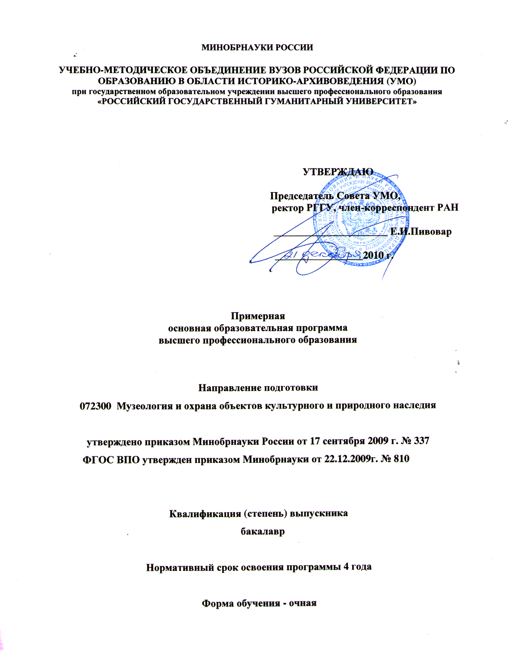 по направлению 072300 «Музеология и охрана объектов культурного и природного наследия»
