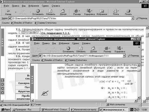 Каждый вопрос имеет подсказку в виде краткого ответа и ссылку на соответствующий материал в учебнике. Если студент затрудняется в ответе или хочет проверить правильность своего ответа, он может сначала воспользоваться подсказкой «Ответ» или гиперссылкой. Например, на вопрос «7.1. Сформулировать общую задачу линейного программирования …” при указании мышью на гиперссылку и нажатии левой кнопки мыши обучающийся получает доступ к соответствующему материалу в ЭУ (рис.1).
