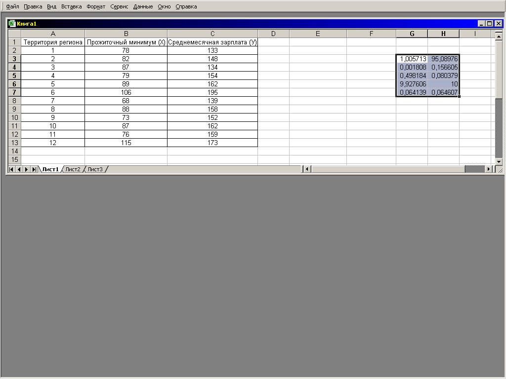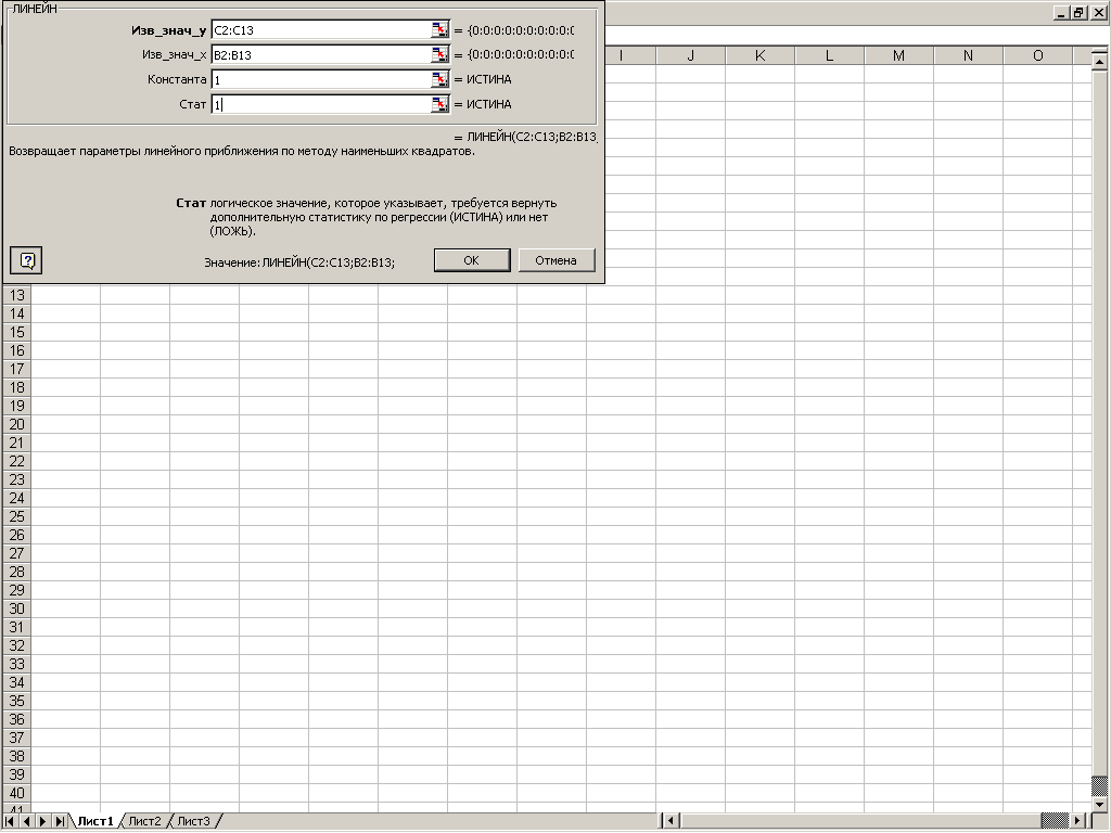 Статистика – логическое значение, которое указывает, выводить дополнительную информацию по регрессионному анализу или нет. Если Статистика=1, то дополнительная информация выводится, если Статистика=0, то выводятся только оценки параметров уравнения.