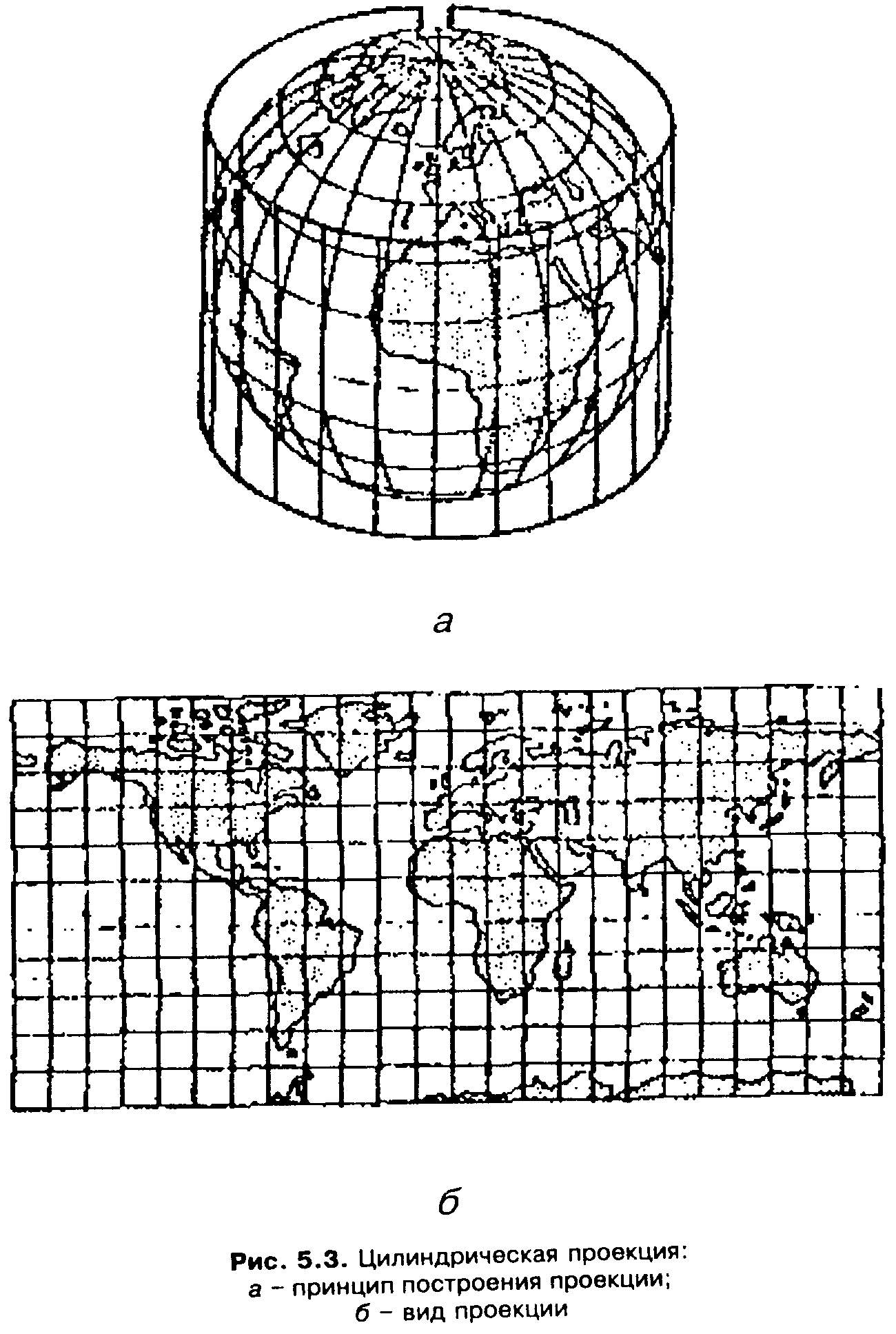 В прямых цилиндрических проекциях одинаково изображаются одни и те же участки земной поверхности вдоль линии разреза - по восточной и западной рамкам карты (дублируемые участки карты) и обеспечивается удобство чтения по широтным поясам (например, на картах растительности, осадков) или по меридианальным зонам (например, на картах часовых поясов).
