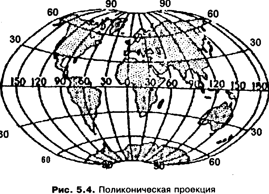 ^ Поликонические проекции (policonic projection). В них параллели изображаются дугами эксцентрических окружностей с центрами на среднем (прямолинейном) меридиане или его продолжении, а меридианы - кривыми, симметричными относительно среднего меридиана (рис. 5.4).
