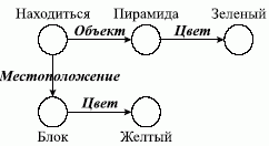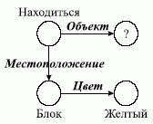 Еще один пример поиска в СС. Представим вопрос "какой объект находится на желтом блоке?" в виде подсети, изображенной на рис. 2.5. Произведем сопоставление вопроса с сетью, представленной на рис. 2.6. В результате сопоставления получается ответ - "Пирамида".