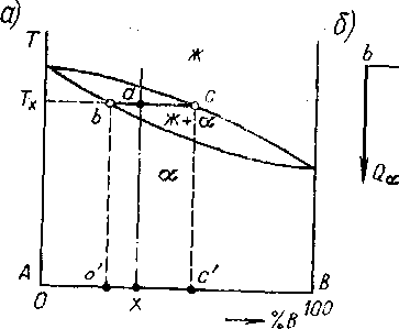 Отсюда следует также, что например, при Т=Тx в решетке компонента А может раствориться максимум b (точнее b'} атомов компонента В, или, другими словами, точка b показывает предельно возможное содержание компонента В в фазе при Т =Тх. То же и при других температурах - линия солидус на рис. 5.3,а показывает состав твердой фазы, а линия ликвидус - жидкой фазы, которые могут находиться в равновесии при данной температуре.