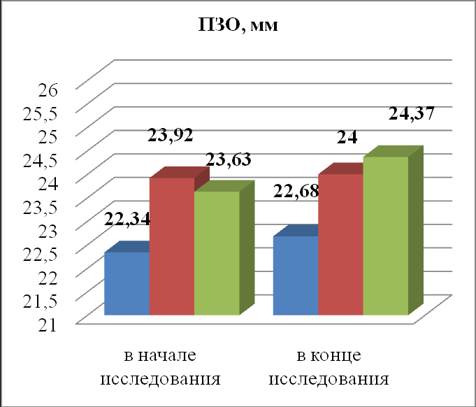 Ультразвуковая биометрия показала недостоверное увеличение ПЗО на 0,08±0,60 мм и достоверное увеличение поперечного диаметра глазного яблока на 0,75 мм (p<0,01) (таблица №2).
