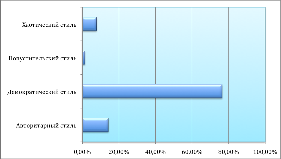 В результате анализа диаграммы мы видим, что в нашей школе больше приветствуется демократический стиль семейного воспитания. Это происходит потому, что процесс воспитания в семье отражает процессы обновления, развития и изменения общества в целом. И поэтому очень многие родители выбирают такой стиль воспитания, так как именно благодаря демократическому подходу к воспитанию подростков, возможно наиболее грамотное становление личности. Такие дети наиболее быстрее и ярче находят себя в социуме.