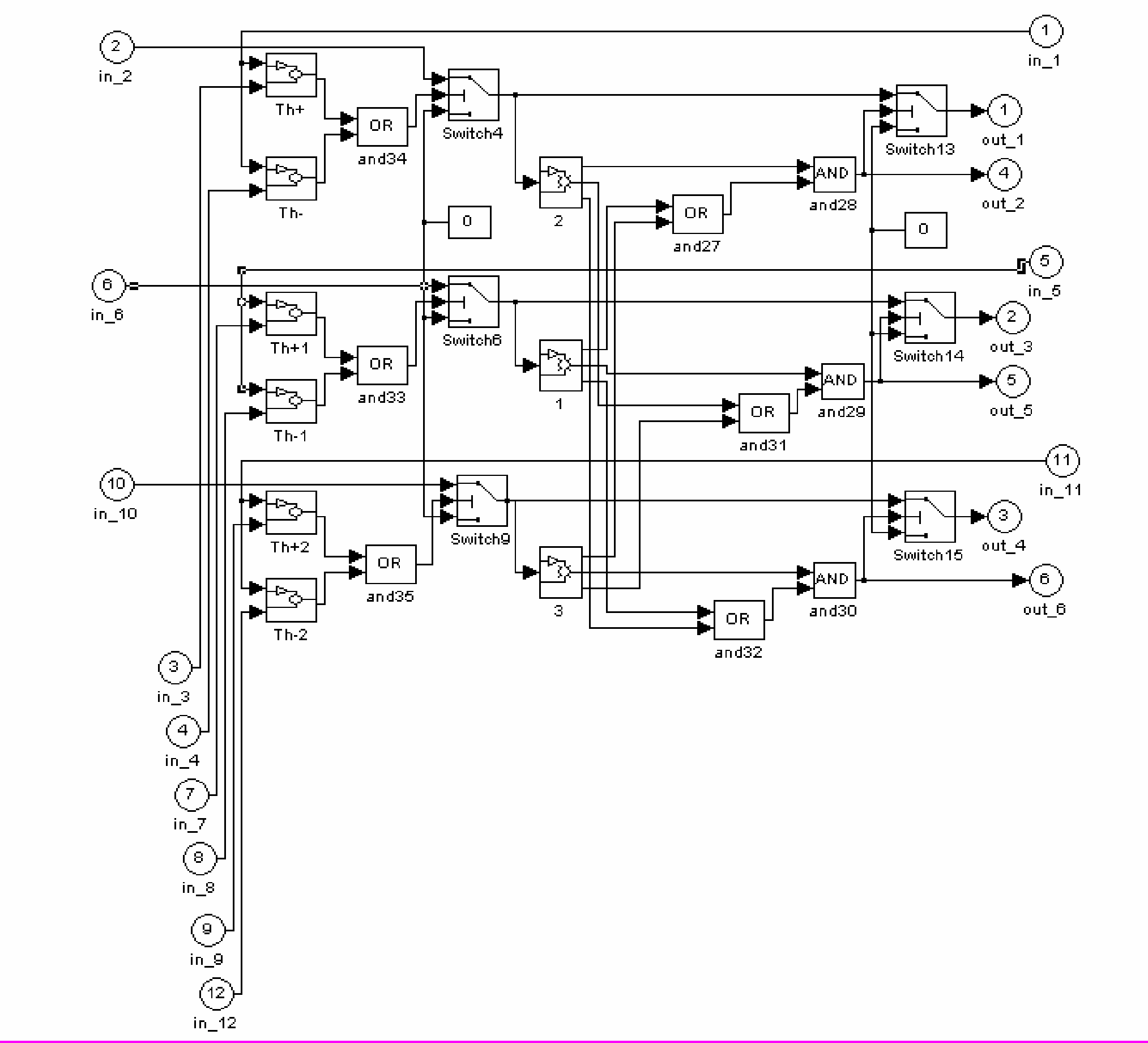 Часть модели, состоящая из блоков 1, 2, 3 (внутренняя структура блоков приведена на рис. 3), логических элементов and27 - and32 и переключателей Switch13 – Switch15 предназначена для исключения физически нереального режима работы двигателя при подключении одной из его обмоток к фазе сети и отключенном состоянии двух других.